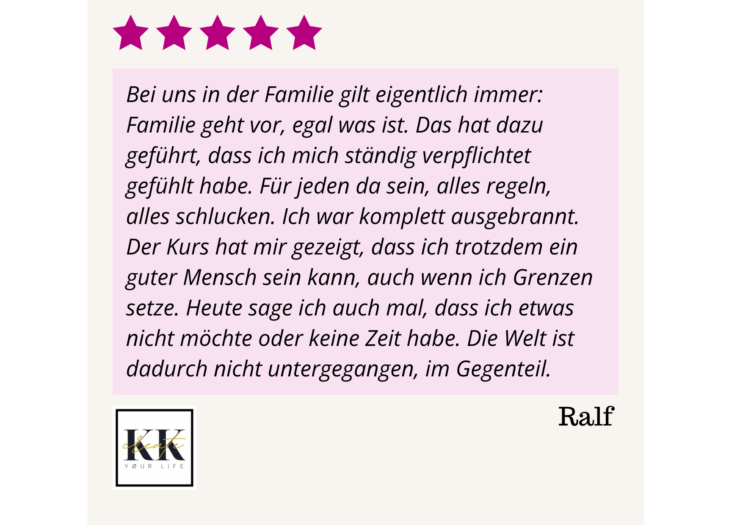 Das Setzen von Grenzen und das kraftvolle Aussprechen eigener Gedanken kann zu Widerstand und Ablehnung führen, weil es die Erwartungen und Gewohnheiten deiner Familienmitglieder, Freunde oder Kollegen herausfordert. Wenn du beginnst, deine Grenzen klar zu kommunizieren, kann dies zunächst auf Unverständnis oder sogar Ablehnung stoßen. Es ist jedoch wichtig zu verstehen, dass dies ein normaler Teil des Prozesses ist und du lernst, wie du trotz dieser Widerstände mit einem gestärkten Selbstbewusstsein bei deinem liebevollen Nein/deiner Haltung bleibst und für dich und deine Bedürfnisse einstehst. Du und deine Gesundheit sind wichtig!